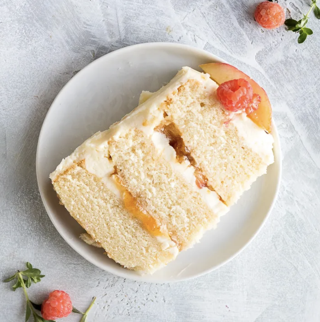 Cinnamon brown sugar cake with peach pie filling, brown sugar buttercream and caramel drip